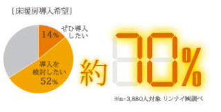 家を建てる時、多くの方が床暖房を導入したいと考えています。暖房機器の中でNO.1の指示を得ている床暖房。家を建てる時やリフォームの機会に約70%の方が床暖房を導入したいと考えています。