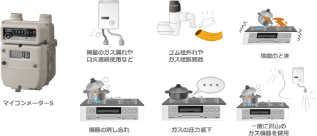 お客さま宅に設置しているマイコンメーターは、ガスを計量する機能の他にさまざまな安全機能が内蔵されており、ガスの流れを常に監視し、異常があった時やいざという時に安全装置が働いて、ガスを自動的にストップします。